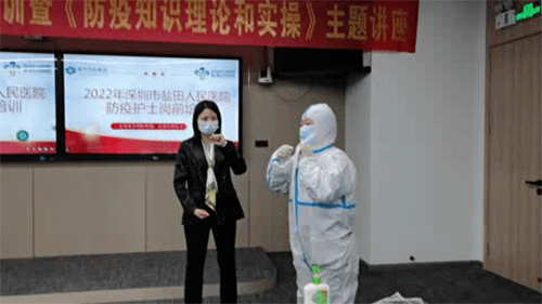 集團特邀醫(yī)院防疫護士向莎莎為新上崗的防疫護士進行崗前培訓(xùn)。培訓(xùn)從穿防護用品(清潔區(qū))、脫防護用品(一脫區(qū))、脫防護用品(二脫區(qū))、穿脫隔離衣四方面。通過理論知識講解和現(xiàn)場操作相結(jié)合的模式,讓新上崗的防疫護士對醫(yī)護防疫工作和流程更加了解。